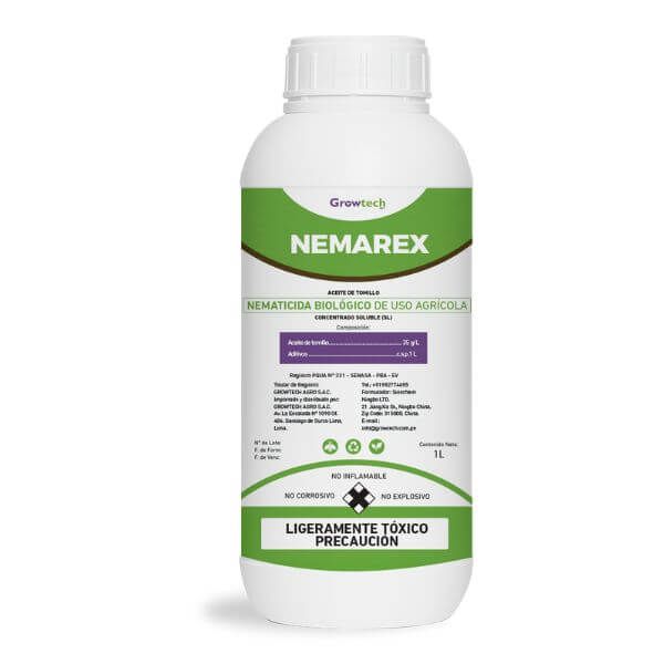 N° DE REGISTRO: N331-SENASA-PBA-EV PRINCIPIO ACTIVO: Aceite de Tomillo 35 g/L EMPAQUE DE: 1L; 20L Nemarex es un producto fitosanitario no riesgoso bajo los estándares de la agencia de protección ambiental de EE.UU. (EPA siglas en inglés), está incluido en la lista OMRI de productos orgánicos. Es un pesticida preventivo y curativo recomendado para el control de nematodos fitoparásitos y enfermedades transmitidas por el suelo. El modo de acción es por contacto. Activa los mecanismos de defensa de la planta. No hay uso restringido, por lo que se puede aplicar durante toda la temporada de crecimiento.